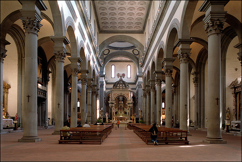 Unlike S. Lorenzo, where Brunelleschi’s ideas were thwarted, here, his ideas were carried through with some degree of fidelity, at least in the ground plan and up to the level of the arcades. The Latin cross plan is so designed to maximize the legibility of the grid. The contrast between nave and transept that caused such difficulty at S. Lorenzo was here also avoided. The side chapels, in the form of niches all the same size (forty in all), run along the entire perimeter of the space.